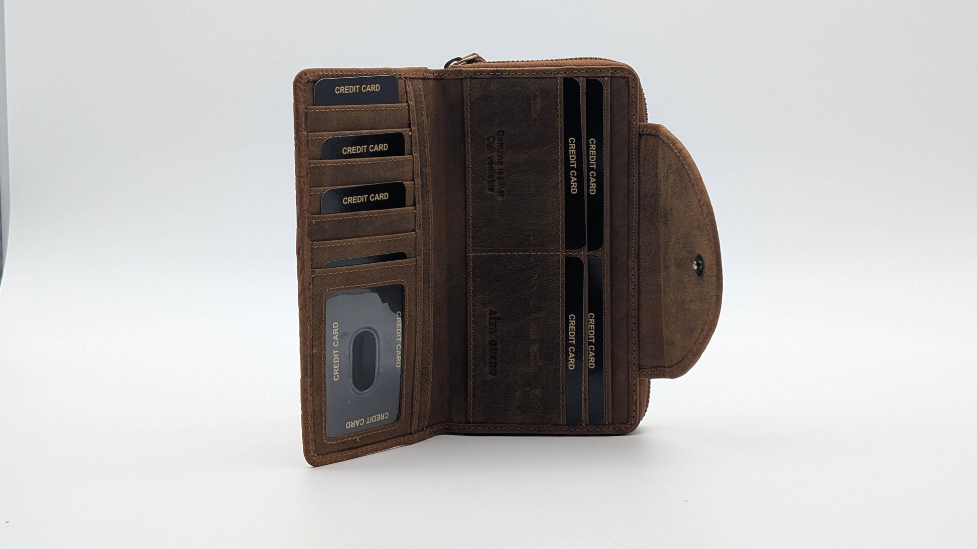This wallet stands at the pinnacle of craftsmanship and luxury, featuring a full-grain leather exterior beautifully embossed with a raised, 3D-like design that gives it both texture and depth. The semi-circular buttoned flap opens to a refined bi-fold interior — the left panel includes an ID slot, six card slots, and two long compartments behind them, while the right panel offers six additional card slots for effortless organization. The zip-secured section reveals three spacious open compartments and a long zip pocket, providing ample space for cash and essentials. Elegant, detailed, and artfully crafted — this wallet is where sophistication meets timeless design.